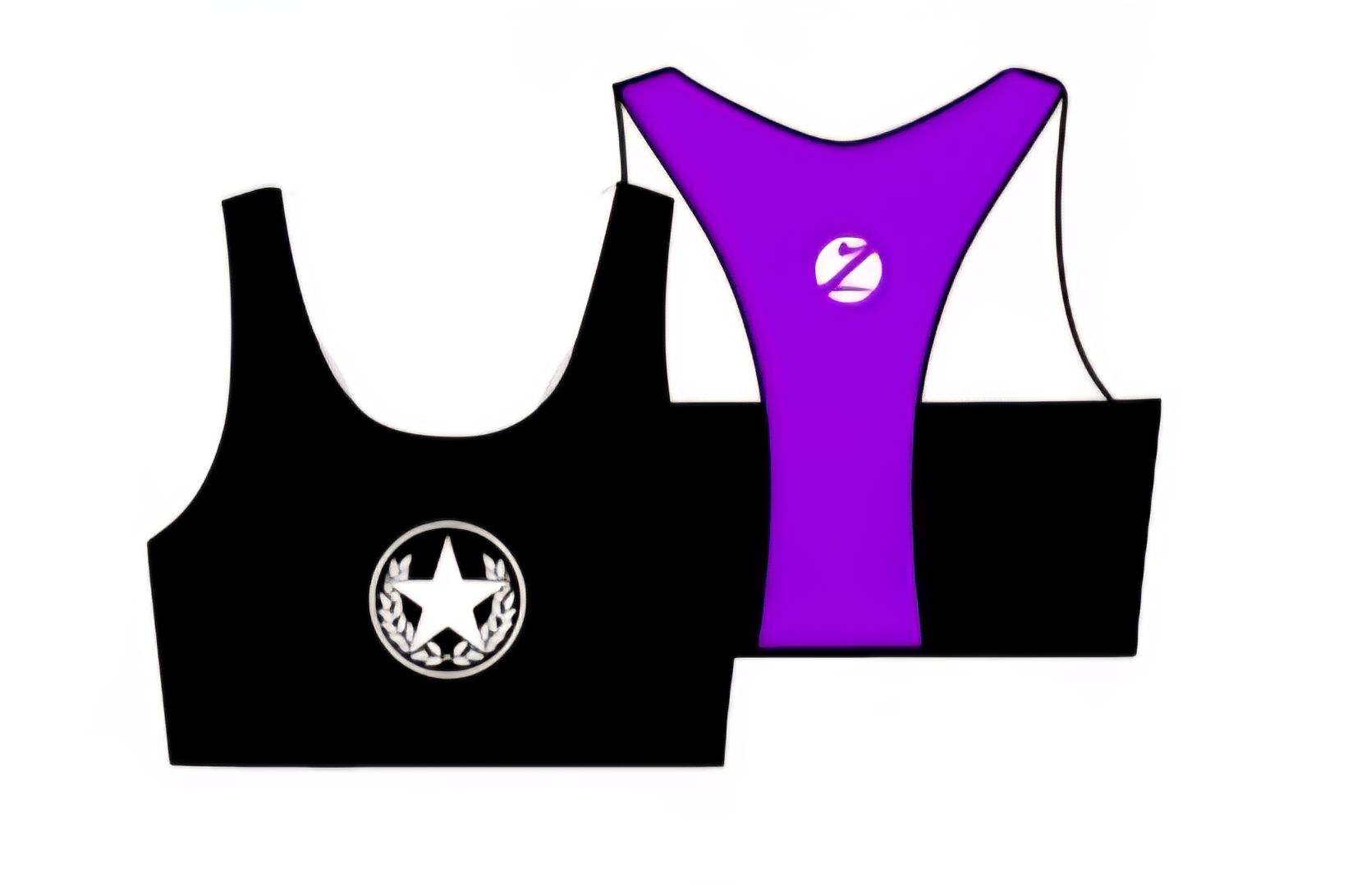 Top deportivo con espalda en Y. Negro con espalda Y en Violeta